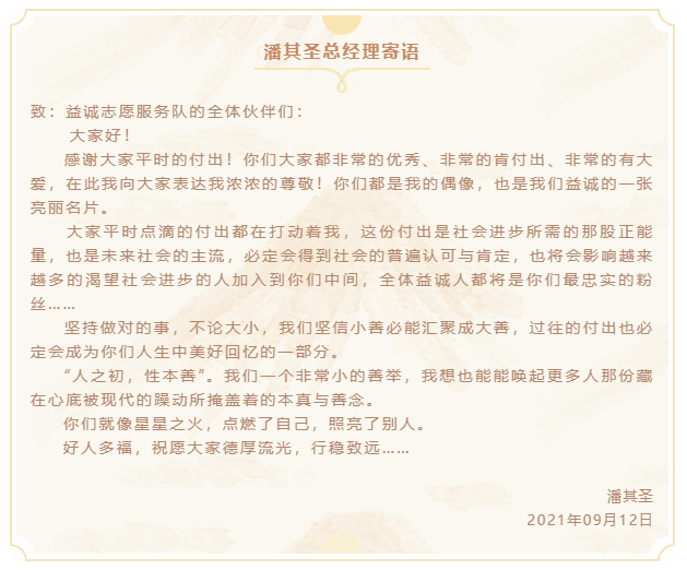 本次團(tuán)建活動結(jié)束后,潘其圣總經(jīng)理特寄語全體志愿者伙伴,勉勵大家德厚流光,行穩(wěn)致遠(yuǎn):